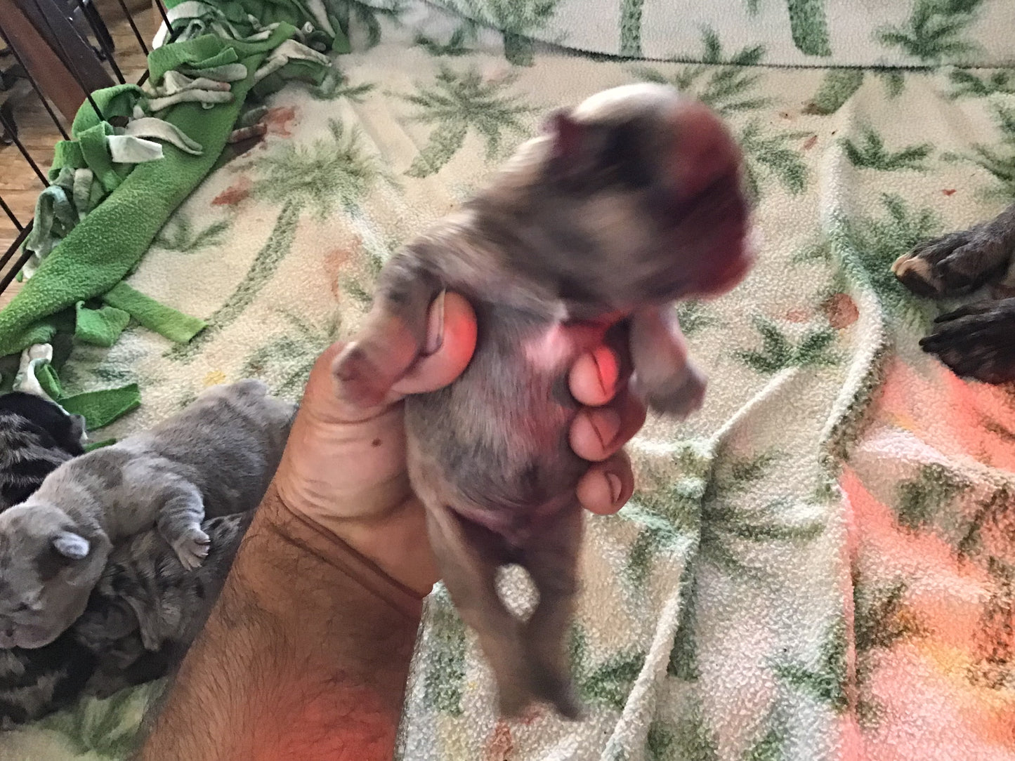 Merle 1/4 fluffy male pink carrier French bulldogs AKC